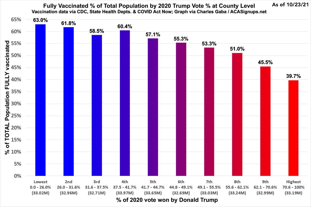 Ironically, prior to the COVID pandemic, ultra-liberal Marin County (Trump only received 16% of the vote here) happened to be one of the birthplaces of the recent "anti-vaxx movement" resurgence, while deep red Sumter County (Trump received 68% of the vote) happens to be home to "The Villages", the massive retirement community where Trump held rallies last summer.