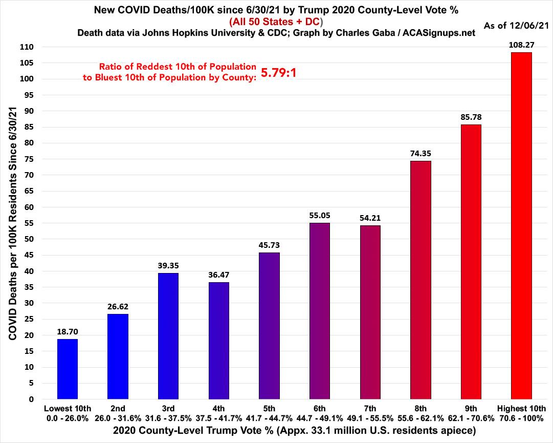 The ratio of death rates has also begun to shrink, with the rate in the reddest tenth now 5.79x higher than in the bluest tenth...which is still down from 6.0x higher six weeks ago, but up from 5.54x higher just last week. Huh. I'm guessing this is a data glitch correction.