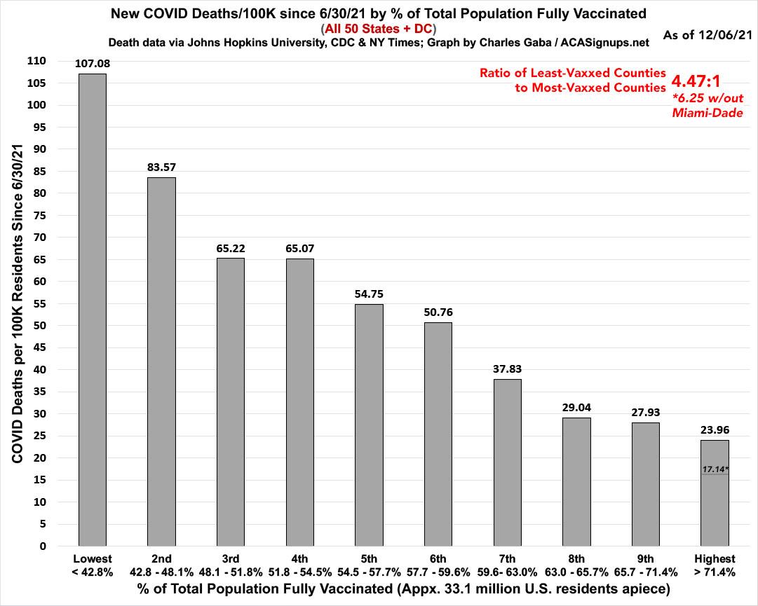 Note: As I explained in a recent blog post, Miami-Dade County is a massive outlier when it comes to the relationship of cases/deaths to the official vaccination rate, and I strongly suspect this is due to a substantially high incidence of "vaccine tourism" combined with the "snowbird" effect. As such, I've started also breaking out what the most-vaccinated tier would look like in terms of both case & death rates if Miami-Dade County was disregarded. As you can see, it's pretty dramatic in both cases: