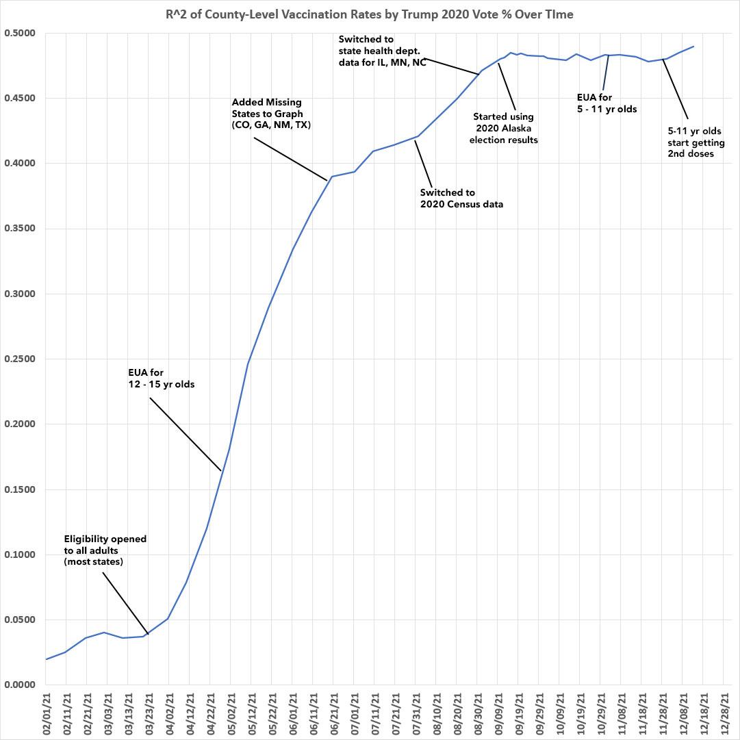 It's also important to note that both the R2 (correlation) and slope formulas, which had plateaued for most of October and November, appear to be increasing again now that the first batch of 5 - 11 year olds have started receiving their 2nd Pfizer shot: