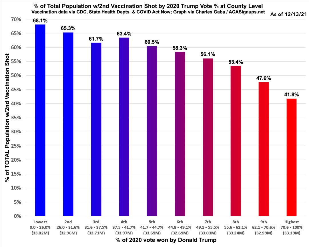 Here's what the data above looks like in bar graph format, broken out in rough deciles (tenths of the total population, or around 33.1 million people apiece). The vaccination rate in the bluest tenth of the nation is running 63% higher than the reddest tenth: