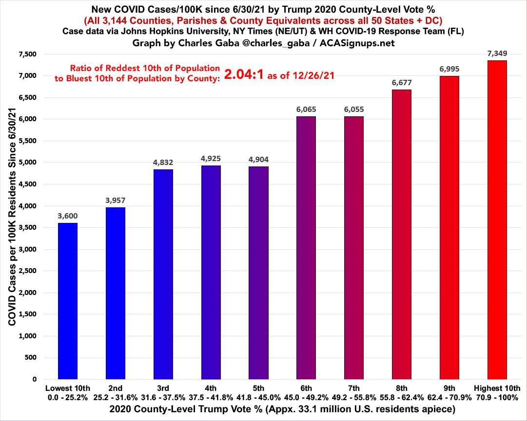 The partisan ratio of case rates are now only running 2.0x higher per capita in the reddest tenth of the country than the bluest tenth, down from 3.0x higher in late October and from 2.4x higher just a week ago: