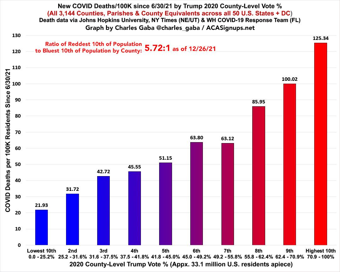 The partisan ratio of death rates since June is now 5.7x higher in the reddest tenth than in the bluest tenth...still down from 6.0x higher in late October, but up from 5.6x a week ago:
