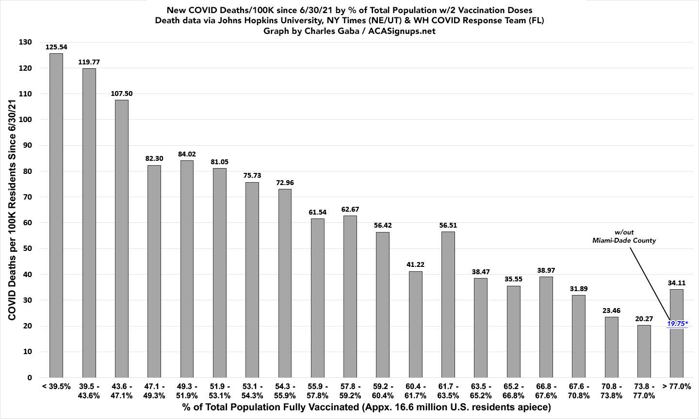 Note: As I explained in a recent blog post, Miami-Dade County, officially part of the "most-vaccinated bracket," is a massive outlier when it comes to the relationship of cases/deaths to the official vaccination rate, and I strongly suspect this is due to a substantially high incidence of "vaccine tourism" combined with the "snowbird" effect. It therefore likely belongs in the 7th or 8th brackets instead & both the case & death rates in the 10th bracket are likely a bit lower still than the official data would indicate.