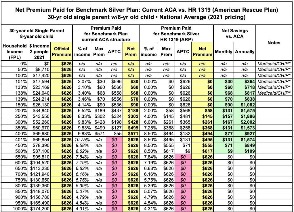 In this version I'm using the actual Advanced Premium Tax Credit (APTC) table under the American Rescue Plan, and I'm cutting out all references to the other two tables to avoid confusion.