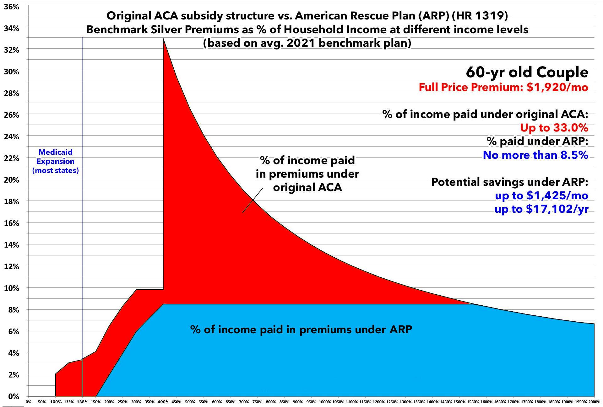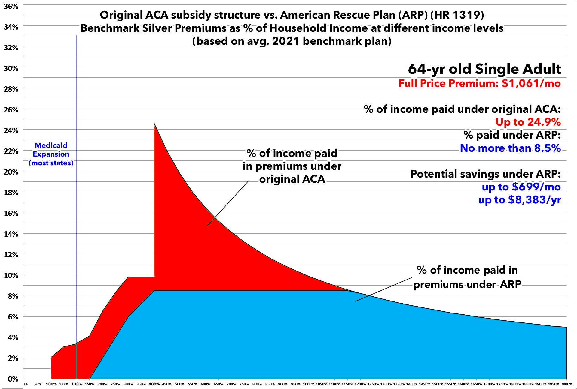 First of all, here's the final, official subsidy table under the ACA today vs. under the American Rescue Plan (ARP). This is the table which will be used at least for 2021 & 2022 (and yes, it's supposed to be retroactive to January 1st, 2021 for current ACA exchange enrollees):