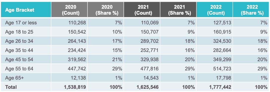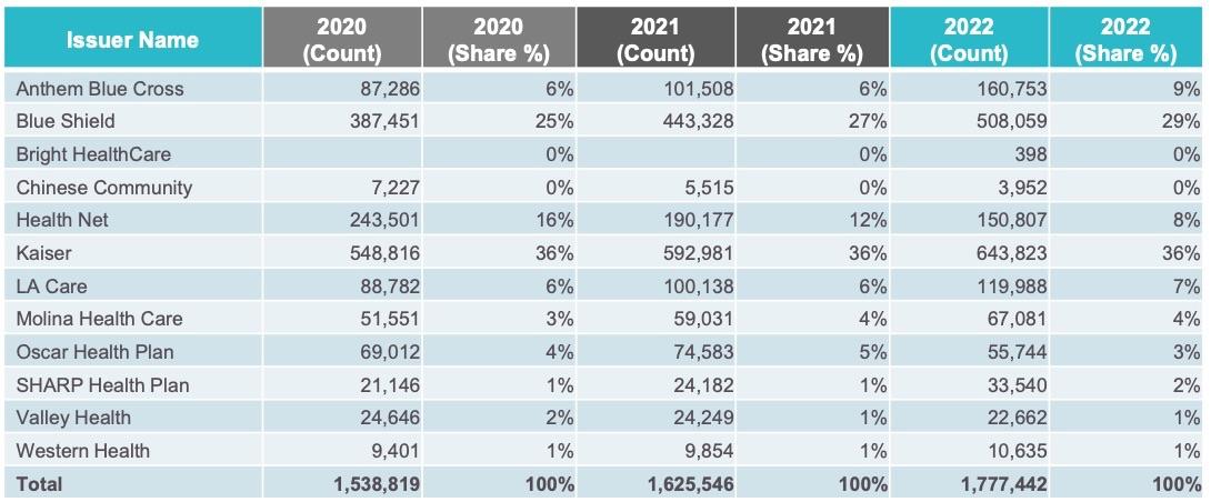 - The top two issuers (Kaiser and Blue Shield) continue to grow their market share: 65% in 2022 vs 63% in 2021 vs 61% in 2020.
