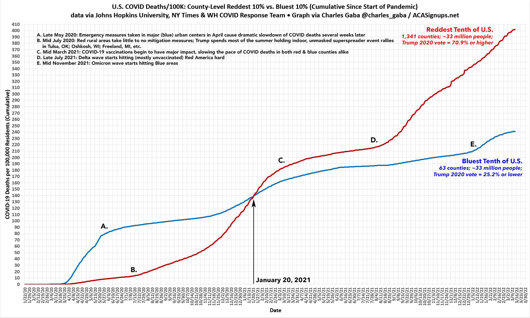 Meanwhile, Red America had things pretty easy until roughly mid-July 2020. From that point on, the death rate in MAGA Country began to catch up to Blue America, eventually crossing the blue line. It's never looked back since: (click image for high-res version)
