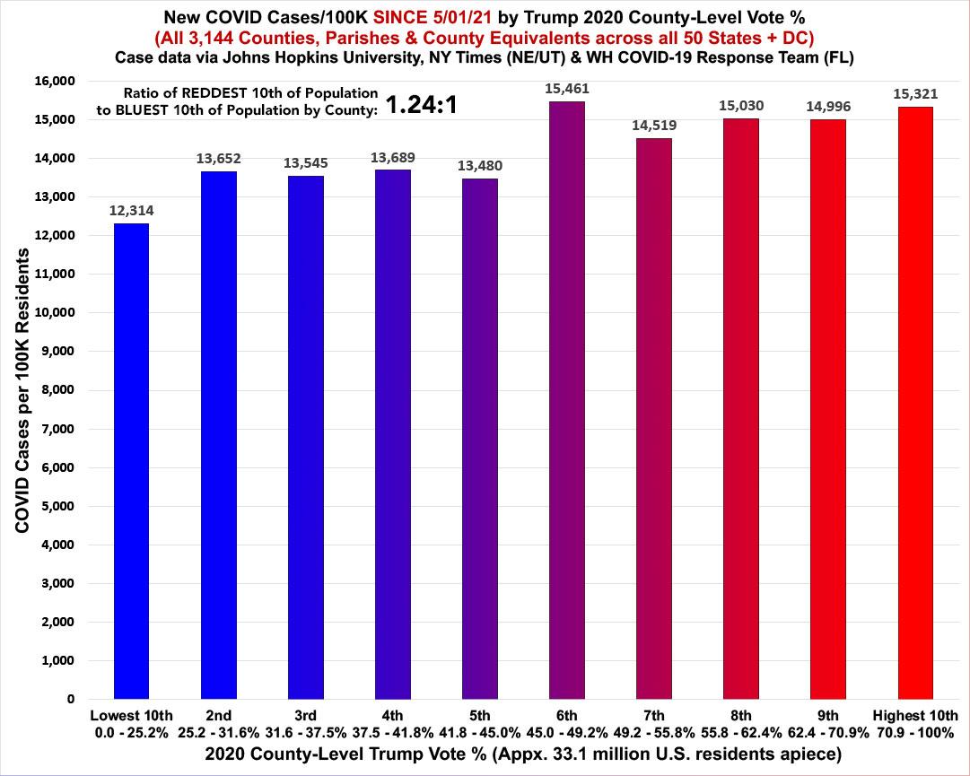 The same is pretty much the case when looking at case rates by red/blue partisan lean...they're still running just 24% higher in the reddest tenth of the country than the bluest, which doesn't seem to signify much...