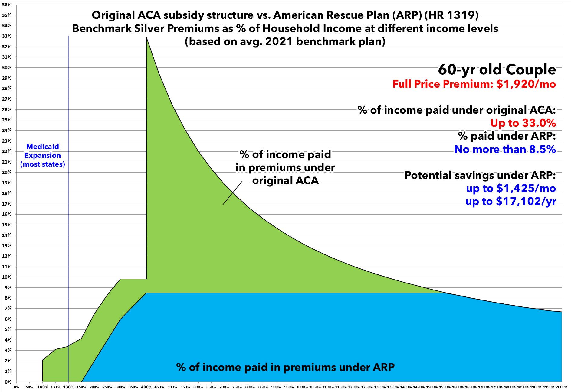 Under the expanded American Rescue Plan subsidy structure, they only have to pay a maximum of 8.5% of their income for the benchmark Silver ACA plan.
