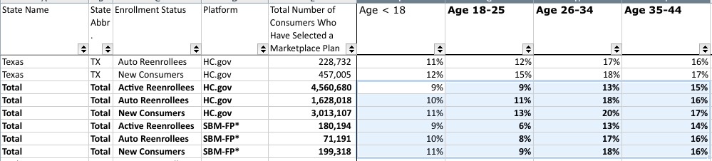 Remember that these numbers only show how many people had signed up for exchange policies in those states as of the end of Open Enrollment each year; due to churn and attrittion, the average number of enrollees each month is somewhat lower...around 68% in 2014 (due to Open Enrollment not actually ending until April 15th) and around 80% every year since: