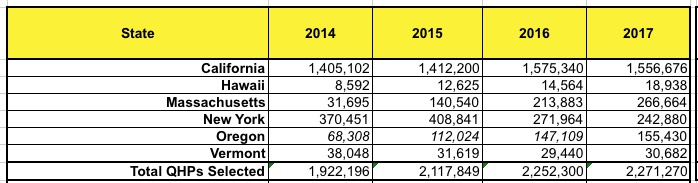 Let's start with the 6 states in which which require all (or nearly all) exchange policies cover abortion. Here's a table listing the official Open Enrollment Period QHP selections for 2014, 2015, 2016 and 2017: