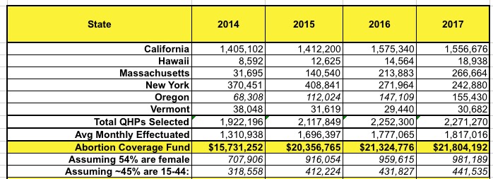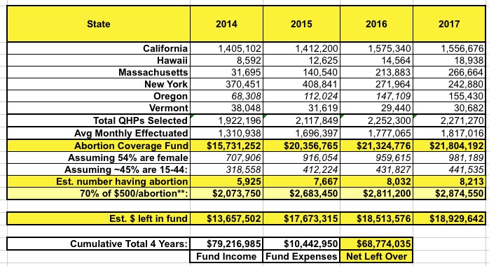Yes, that's right: To the best of my calculations, by the end of 2017, carriers in these 4 states will have brought in roughly $79.2 million into these special "abortion funds" but will only have paid out perhaps $10.4 million of it to pay for around 30,000 abortions, leaving over $68 million just sitting in the accounts gathering dust (and interest?). Even if they cover 100% of the procedure, that's still less than $15 million.