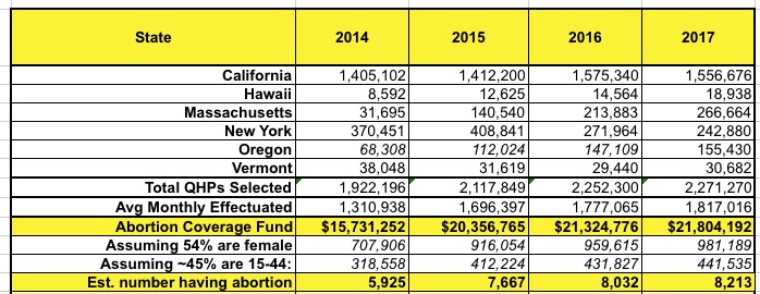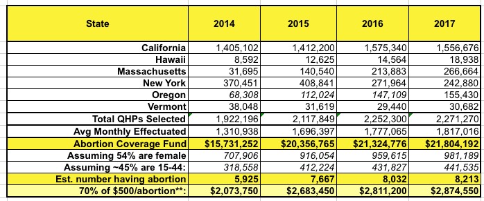 How about the other states which allow and offer policies which cover abortion? That gets even trickier since I don't know what portion of their exchange enrollees are actually in such plans. I'm going to assume perhaps 50% are enrolled in policies which include abortion coverage and 50% aren't: