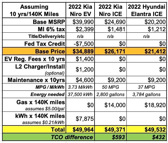 - The additional $140/year state EV registration fee Michigan charges (among the highest in the country). Technically only $40 of this is to replace the lost gas tax revenue; the other $100 is just sort of...added on for no particular reason. Over 10 years (assuming it doesn't change) that's an extra $1,400.