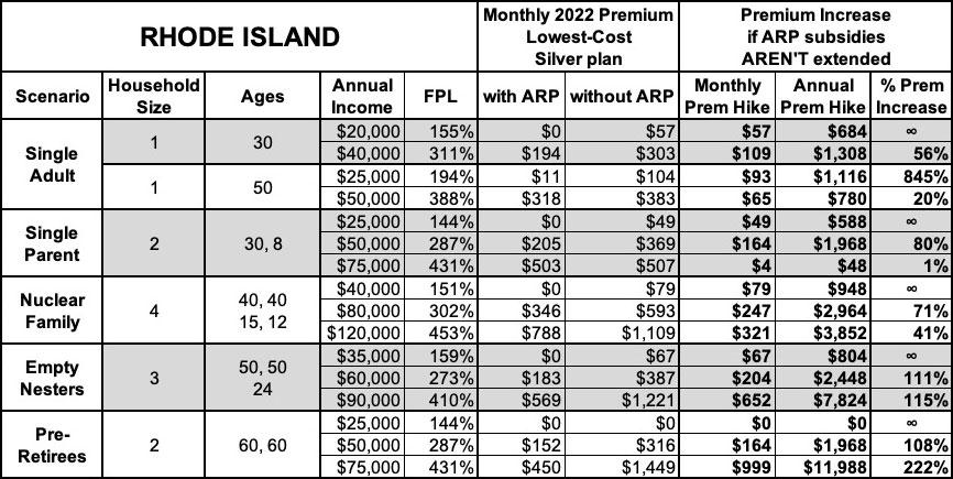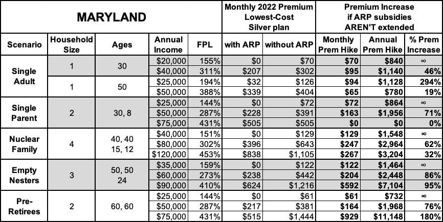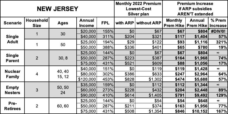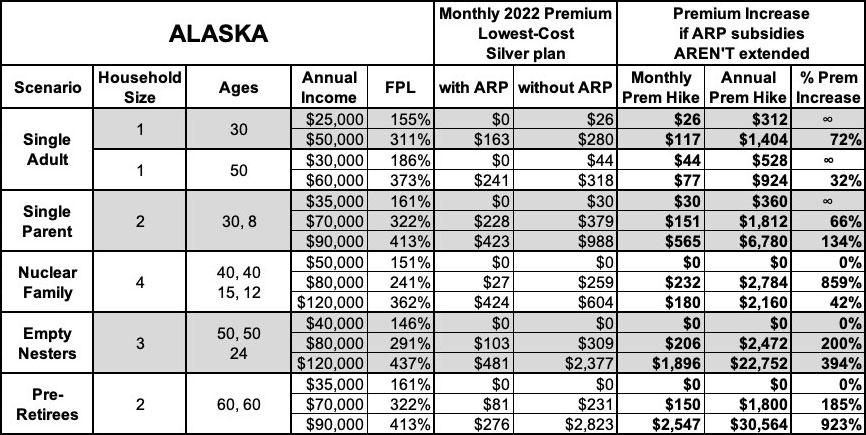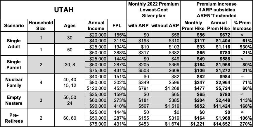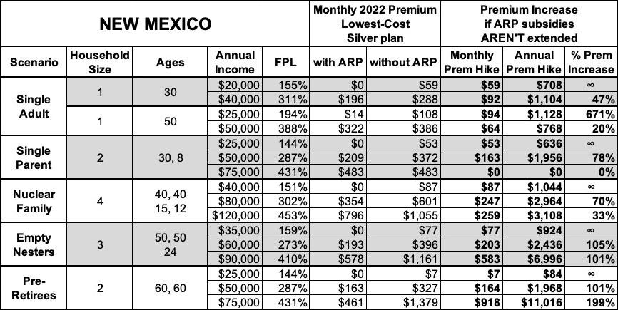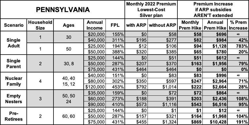 I concluded that, on average, the young adult would have to pay as much as $1,500 more per year; the middle-aged adult would have to pay up to $3,200 more; the family of four would have to pay up to $7,300 more; and the 60-year old couple could potentially be looking at as much as a jaw-dropping $17,000/year premium increase...again, assuming the expanded ARP subsidies aren't extended beyond December 31, 2022.