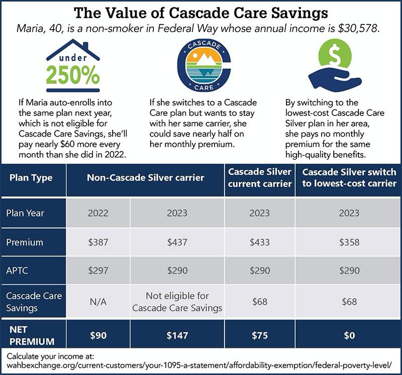 Cascade Care Savings maximizes all available federal tax credits, and also helps customers who do not qualify for federal subsidies. The exact amount of savings received is based on where the person lives, their age and their income. In 2023, Cascade Care Savings can reduce premiums by up to $155 a month.