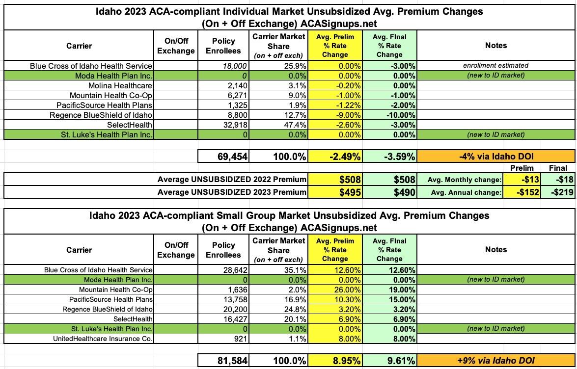 Idaho: Final avg. unsubsidized 2023 #ACA rate changes: -3.6% (was -2.5%)