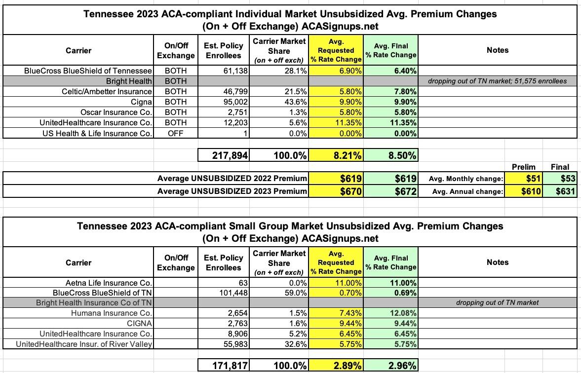 Tennessee: Final avg. unsubsidized 2023 #ACA rate changes: +8.5%