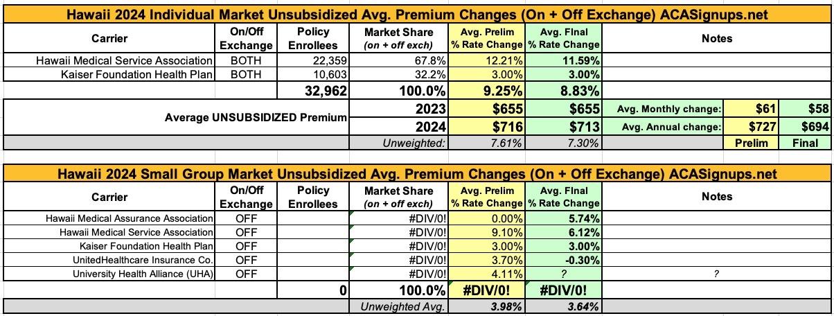 Hawaii: *Final* avg. unsubsidized 2024 #ACA rate changes: +8.8% (updated)