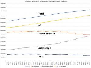 The most significant takeaway here is that traditional Medicare enrollment continues to be flat (or even down slightly), while Medicare Advantage (MA) enrollment continued to increase..putting Medicare Advantage enrollment at 48.9% of the total.