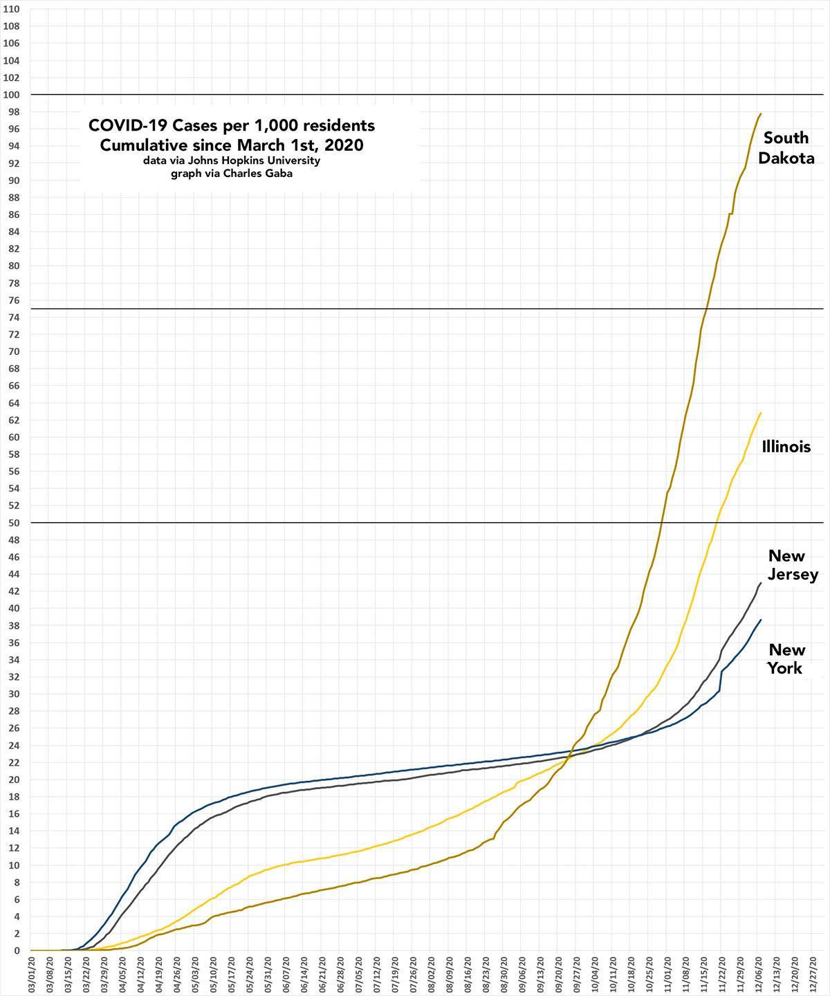 In other words, South Dakota now has a 56% higher COVID-19 case rate than Illinois, 128% higher than New Jersey and 153% higher than New York.