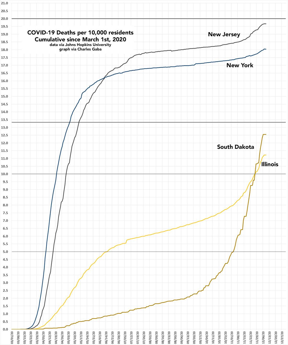 Again: It's possible that NJ, NY & IL will continue to curve upwards while South Dakota may drop off dramatically...but at the current trajectories, I'd expect both NJ & SD to break 20 COVID-19 deaths per 10,000 residents by the end of the year. That's 1 out of every 500 residents dead.