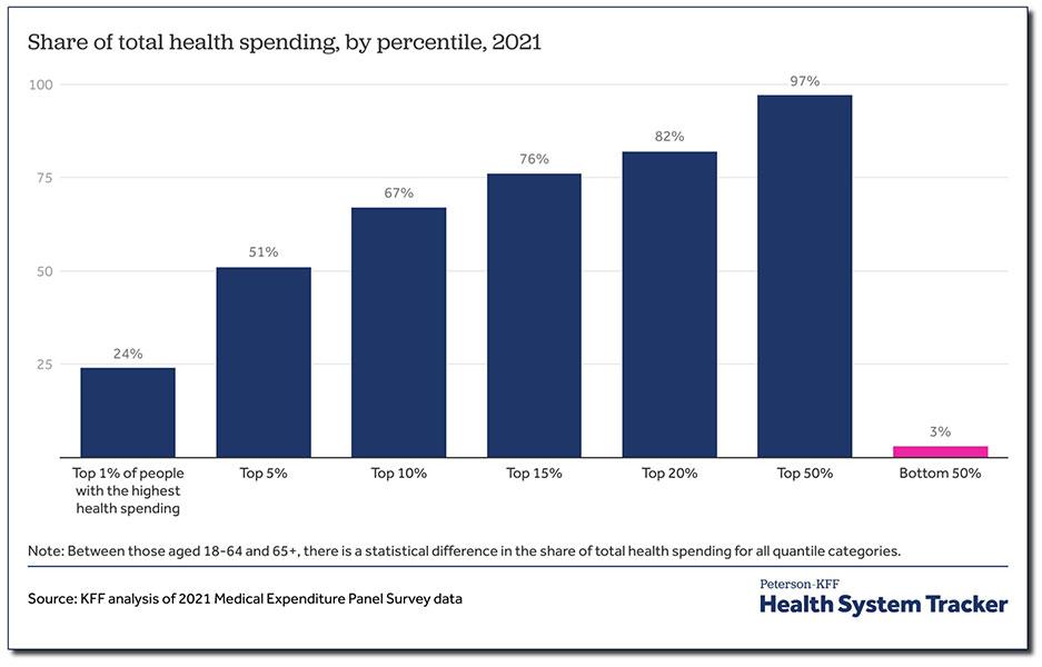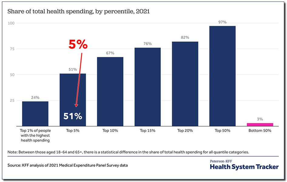 5% of the population accounts for over half of total healthcare spending; and 50% of the population accounts for full 97% of all healthcare spending.