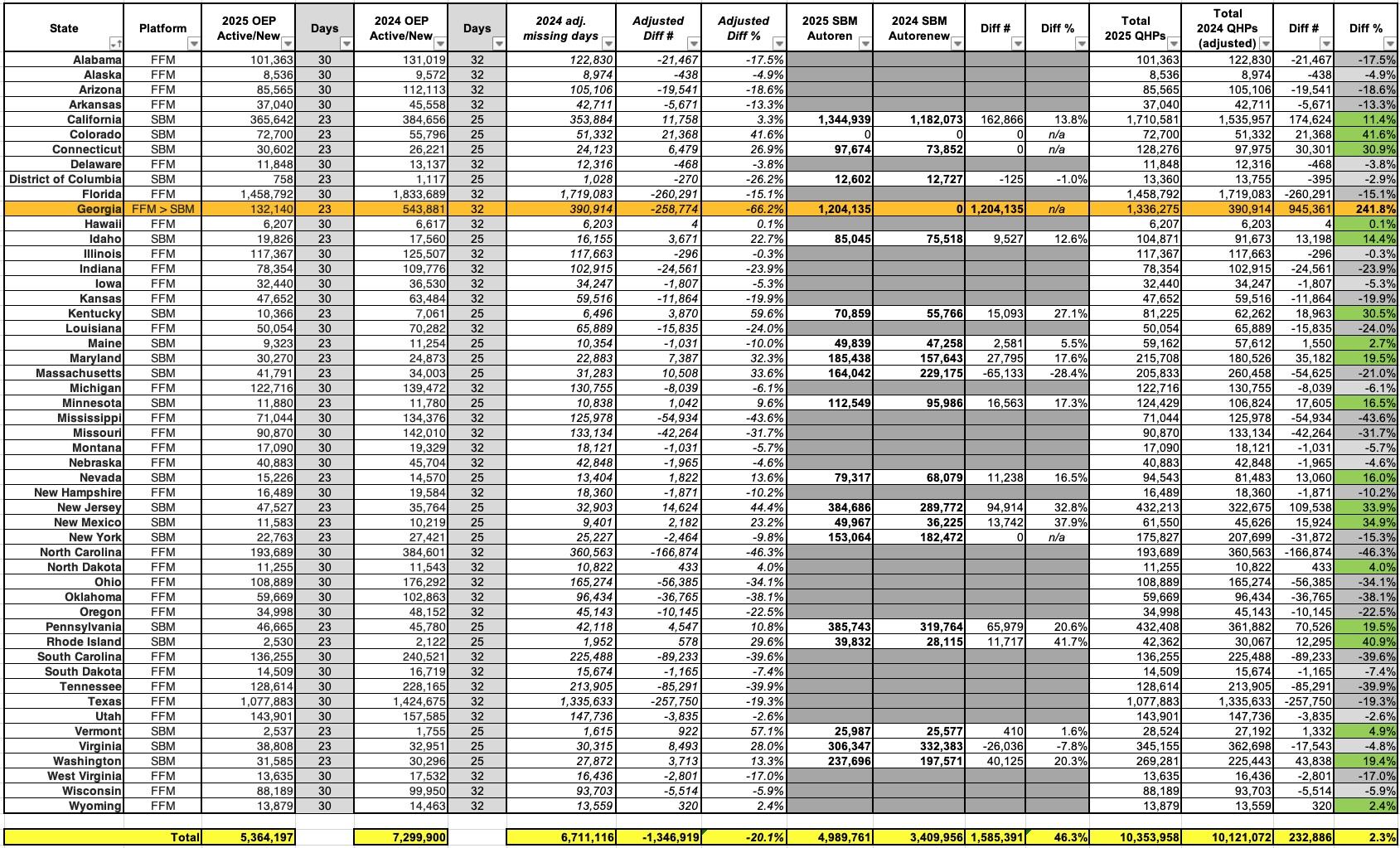 This is important for several reasons. The 2024 data above includes Georgia as an FFM state...but the 2025 data has it rightly listed as an SBM state. The problem is that unlike every other state which has to be adjusted from either 32 to 30 days or from 25 to 23 days...Georgia has to be adjusted from 32 days to 23 days!