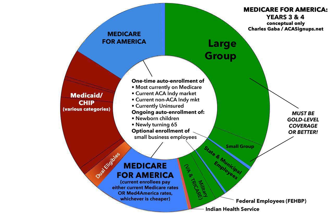 • Year 3: The fully comprehensive version of Med4America starts autoenrolling everyone currently uninsured; those enrolled in the individual market; those enrolled in short-term plans & other non-ACA compliant plans; existing Medicare enrollees (with current Medicare enrollees continuing to pay existing rates); all newly-eligible Medicare enrollees (i.e., those turning 65); and all newborn babies (around 4 million per year). Small businesses could also optionally start enrolling their employees into Med4America as well.