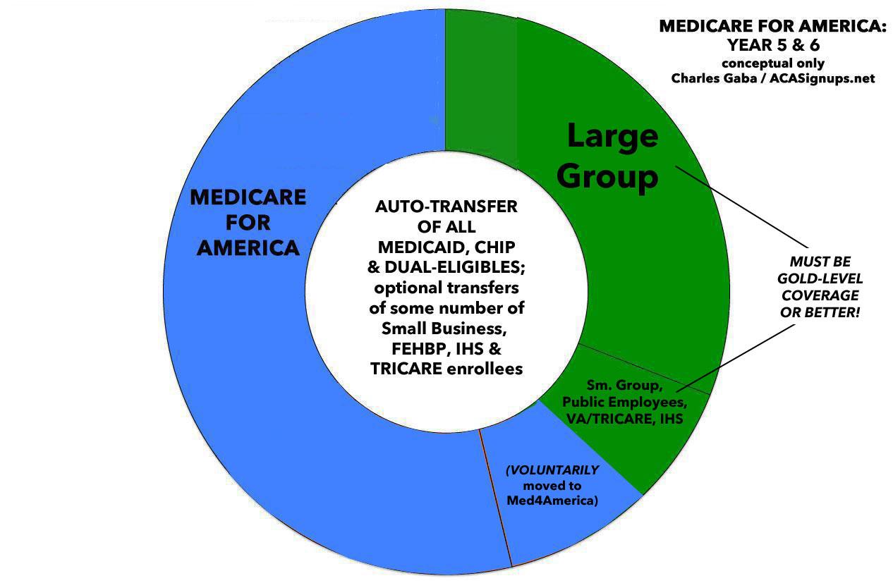 Assuming all went smoothly (which is obviously a huge assumption), by the 8th year or so, thanks to the continuing auto-enrollments of newborn children and those turning 65 each year, a good 2/3 of the population should be enrolled in Med4America. The FEHBP, IHS, TRICARE and the VA would all remain in place...but those enrolled in the first three programs would have the option of being shifted over to Medicare for America just like those with employer coverage.
