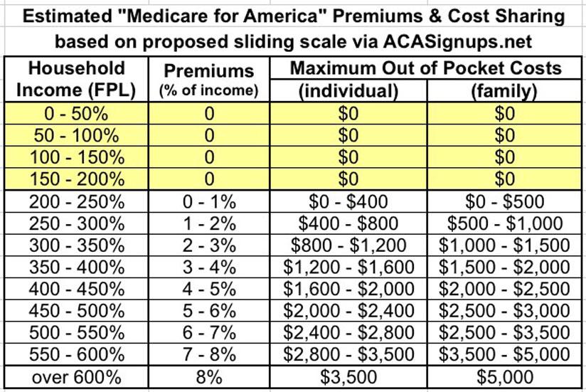 Premiums, to be established by the Secretary, will be no more than 8% of individuals’ or households’ monthly income. Current Medicare beneficiaries will pay either Medicare’s premium (how it is presently calculated) or Medicare for America’s, whichever is cheaper. And, individuals and families between 200 and 600 percent of the Federal Poverty Level will receive subsidies. Those below 200 percent will have no premiums or cost-sharing. There will be no deductibles under Medicare for America. Maximum out of pocket costs for an individual (including seniors and current Medicare beneficiaries) will be $3,500; $5,000 for families (based on a sliding scale for individuals and families between 200 and 600 percent of the Federal Poverty Level).
