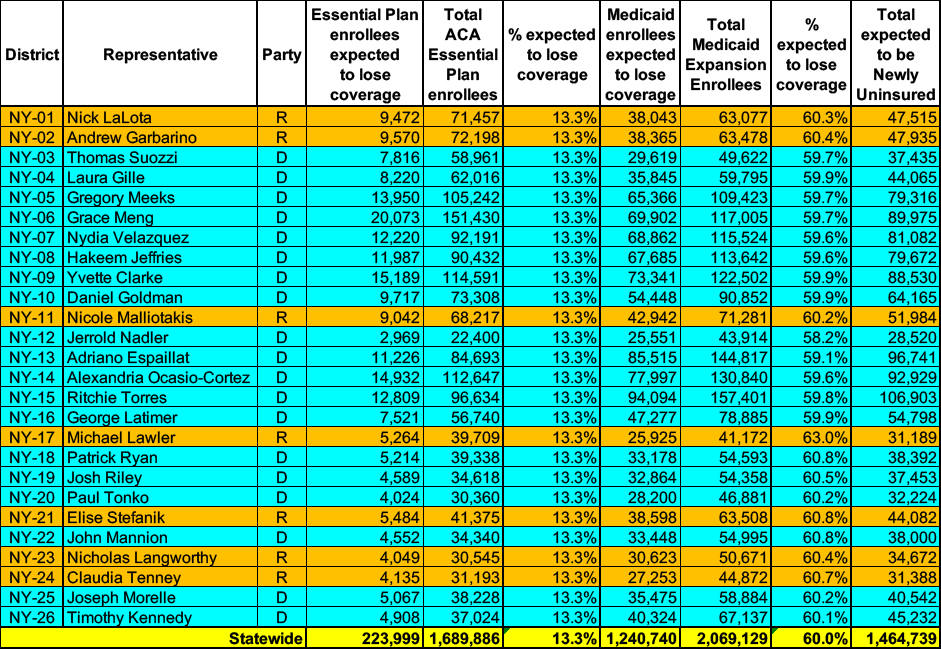 The current provisions of the bill would decimate federal funding for Medicaid and the Essential Plan and cause almost 1.5 million New Yorkers to lose their health coverage and become uninsured.
