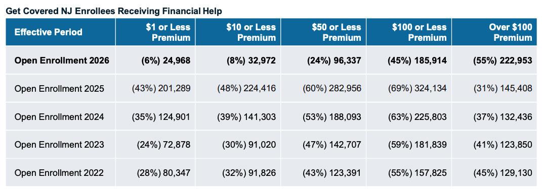 In 2025, 43% of New Jersey enrollees paid no more than $1/month in premiums. In 2026 this is down to 6%.