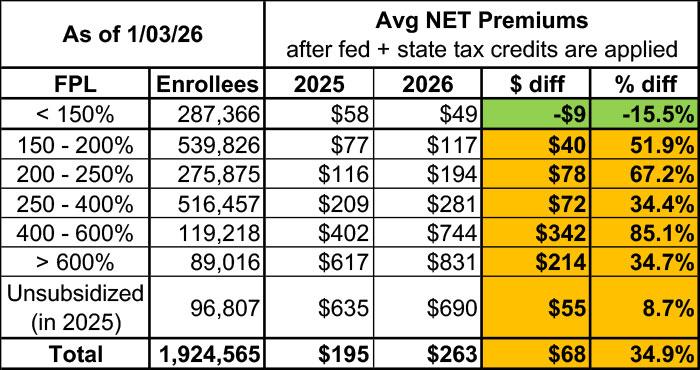It's also worth noting that those state subsidies for the < 150% crowd came at a price: Most of the funds for it actually came from an existing program which wiped out subsidies for most enrollees the past few years, which means that in 2026...