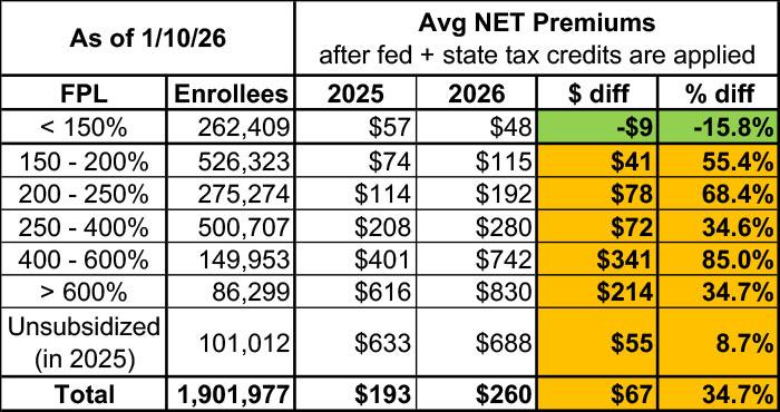 It's also worth noting that those state subsidies for the < 150% crowd came at a price: Most of the funds for it actually came from an existing program which wiped out subsidies for most enrollees the past few years, which means that in 2026...