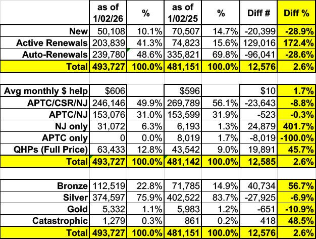 The January 2nd caveat is important, because yesterday's CMS report, which includes an additional 8 days of enrollment, shows that only 89 additional NJ residents enrolled between 1/02/26 - 1/10/26, which doesn't exactly bode well for the remaining 3 weeks of Open Enrollment which haven't been recorded yet (NJ's deadline is 1/31, 2 weeks later than most states).