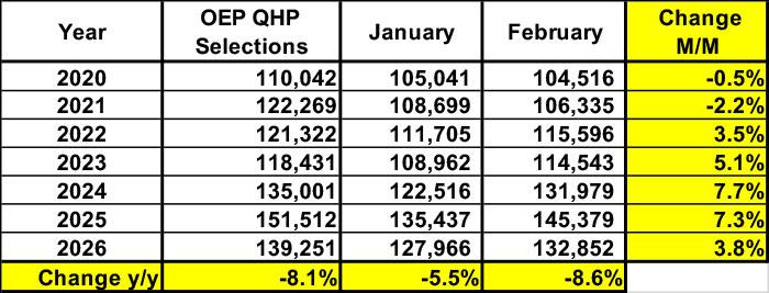 The first thing to notice is that while total Open Enrollment Period plan selections dropped by 8.1% from 2025 to 2026, effectuated enrollment as of February has dropped even more, by 8.6%. This is also reflected in the January - February effectuated change, which has increased each year since 2022, but only increased about half as much in 2026 (+3.8%) vs. 2025 (+7.3%).