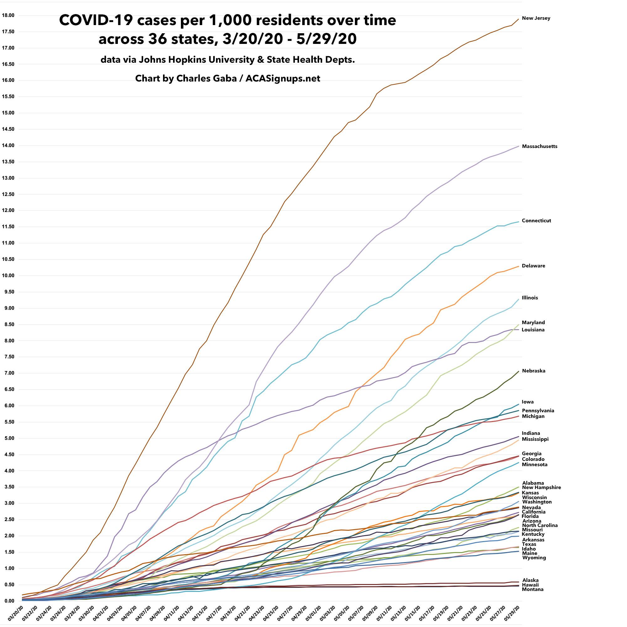 Meanwhile, here's how cases have spread on a per capita basis across those 26 states from March 20th until May 29th. At the high end, I haven't gotten to two of the worst-hit states yet (New York & Rhode Island); at the lower end, there's a cluster of states which are difficult to separate out at this level as they're running so close together.