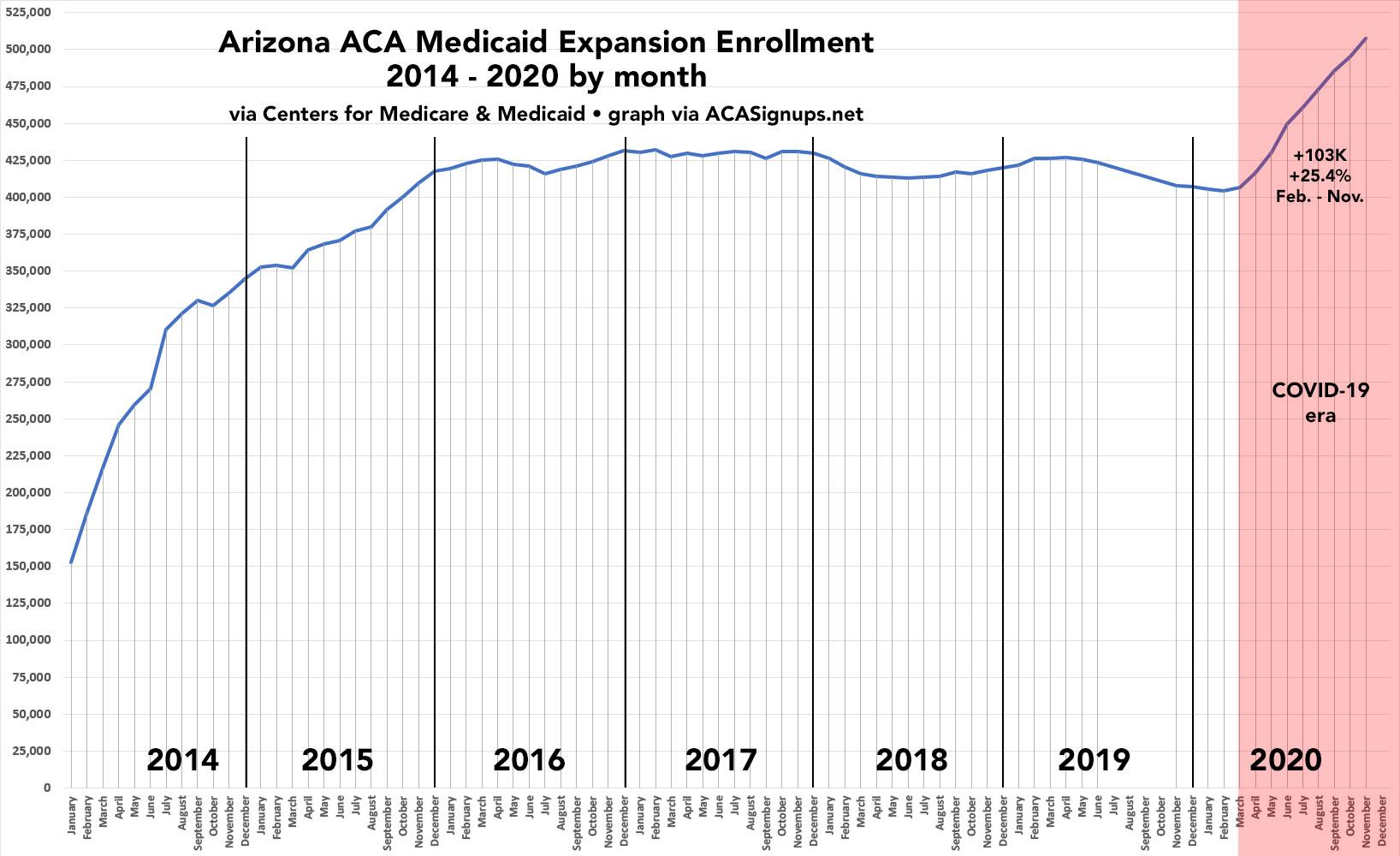Over at Xpostfactoid, my colleague Andrew Sprung has been doing a great job of tracking ACA Medicaid expansion enrollment growth since the onset of the COVID-19 pandemic this past February/March at the macro (national) level, by looking at around a dozen states which have monthly reports available. He puts the overall enrollment growth rate at 23.6% from February thorugh October 2020.