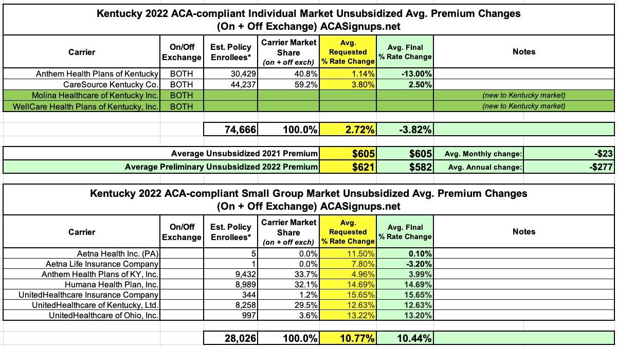 The Kentucky Insurance Dept. has posted both the requested and approved 2022 rate filings for the individual and small group markets, and in addition to drastically slashing the average premiums for Anthem's individual market offerings and Aetna's small group offerings, there's also two new entrants into Kentucky's individual market: Molina and WellCare.