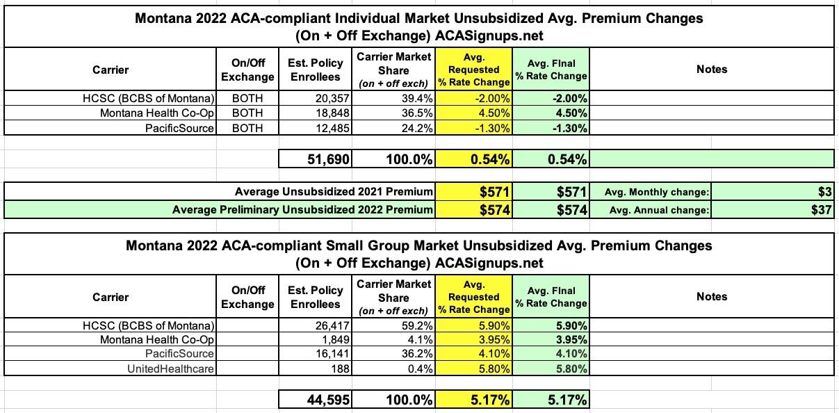 In any event, not much to say about Montana's ACA markets in 2022: No new carriers are jumping in, no current ones are dropping out, and the rate changes are pretty straightforward: +0.5% on the individual market, +5.2% on the small group market.
