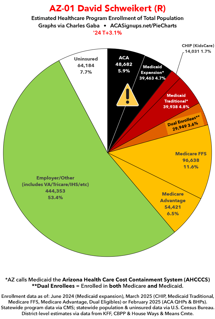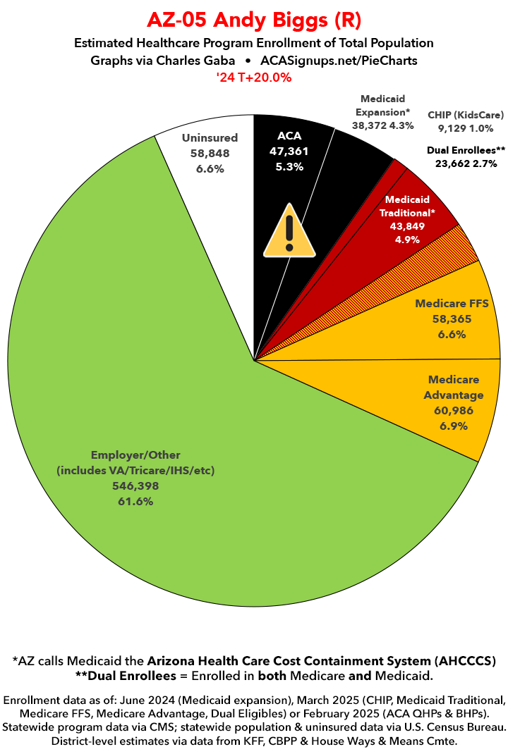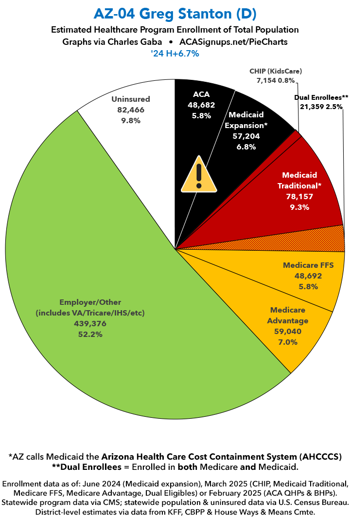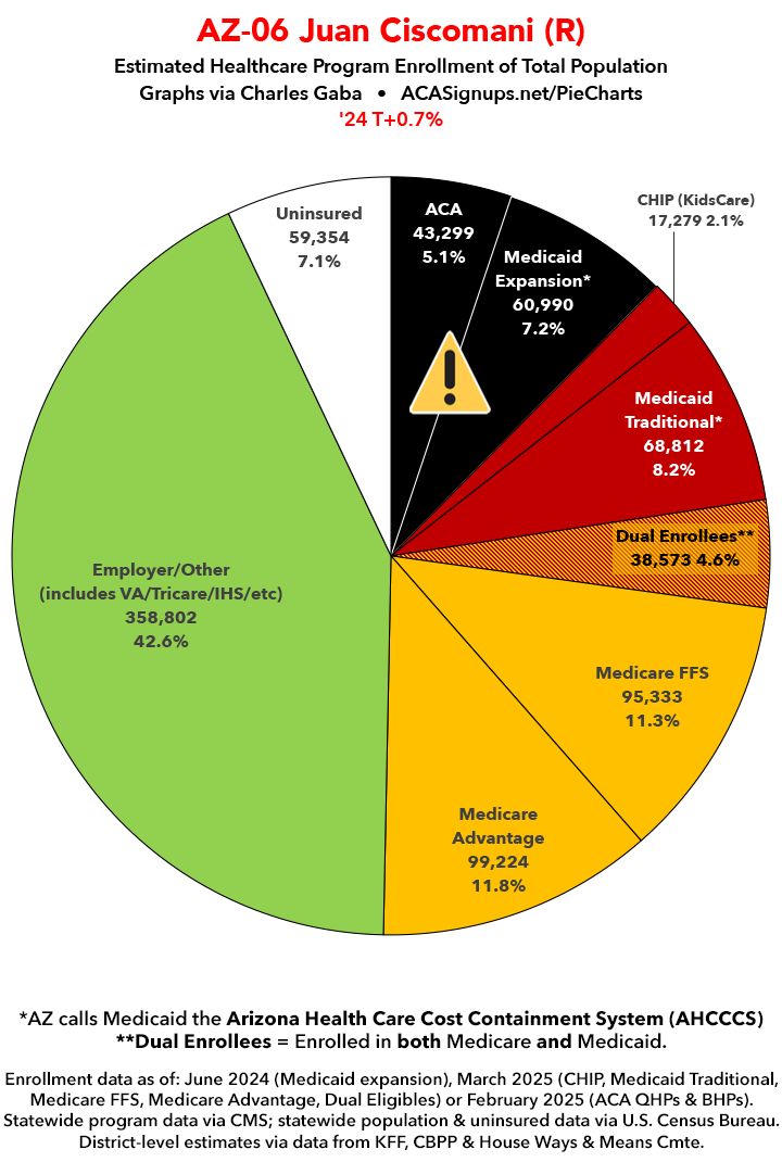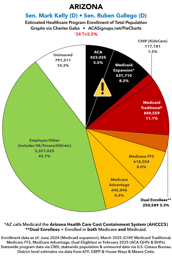 UPDATE 7/1/25: I've updated the web versions of the graphics with the most up-to-date enrollment data I have access to. The black sections w/the ⚠️ symbol are those most at risk of losing healthcare coverage due to H.R. 1, the "One Big Beautiful Bill Act" (aka the #MAGAMurderBill).