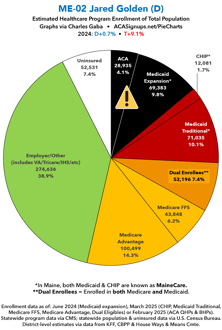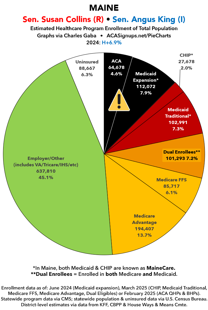 UPDATE 7/16/25: I've updated the web versions of the graphics with the most up-to-date enrollment data I have access to. The black sections w/the ⚠️ symbol are those most at risk of losing healthcare coverage due to H.R. 1, the "One Big Beautiful Bill Act" (aka the #MAGAMurderBill).