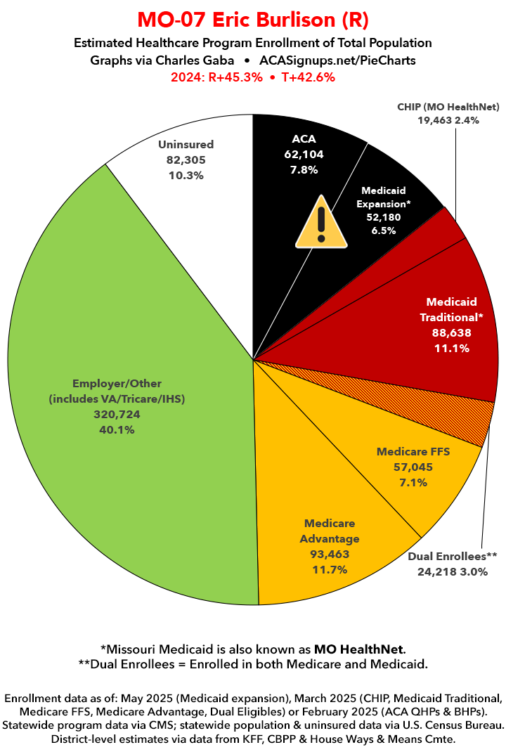 UPDATE 7/6/25: I've updated the web versions of the graphics with the most up-to-date enrollment data I have access to. The black sections w/the ⚠️ symbol are those most at risk of losing healthcare coverage due to H.R. 1, the "One Big Beautiful Bill Act" (aka the #MAGAMurderBill).