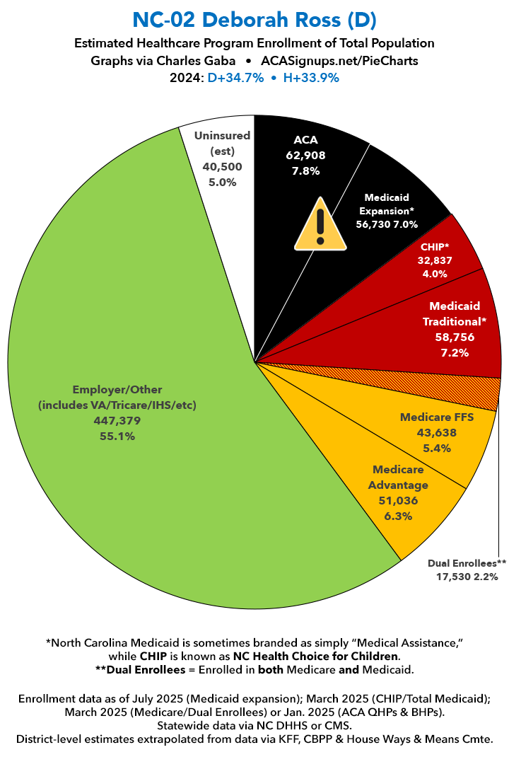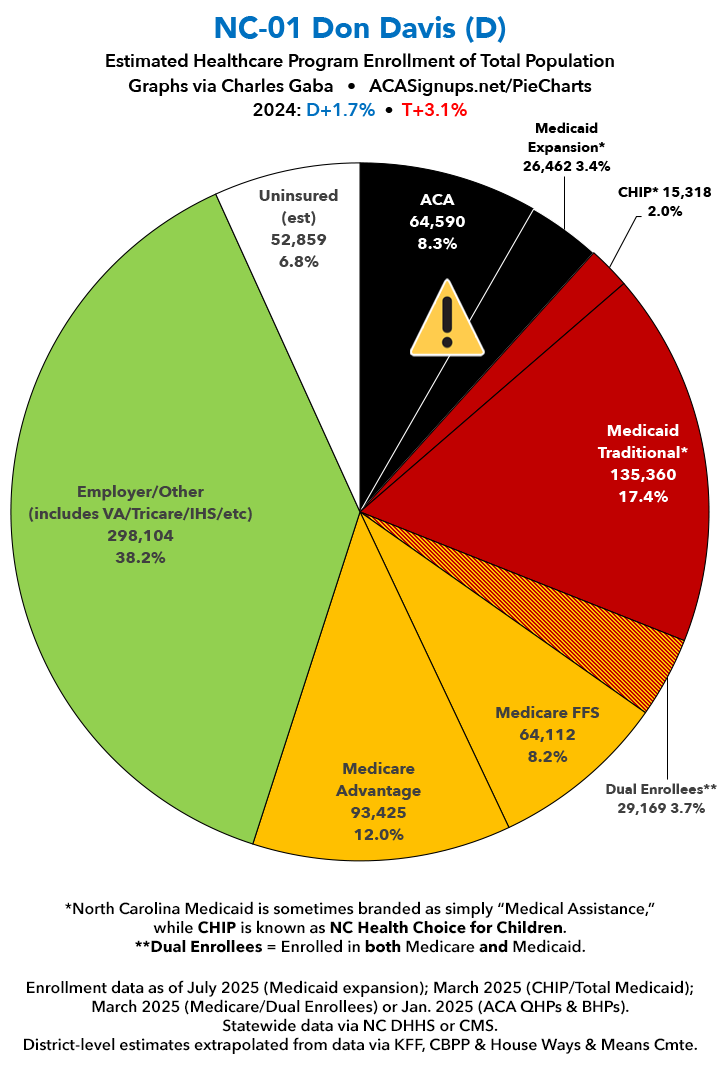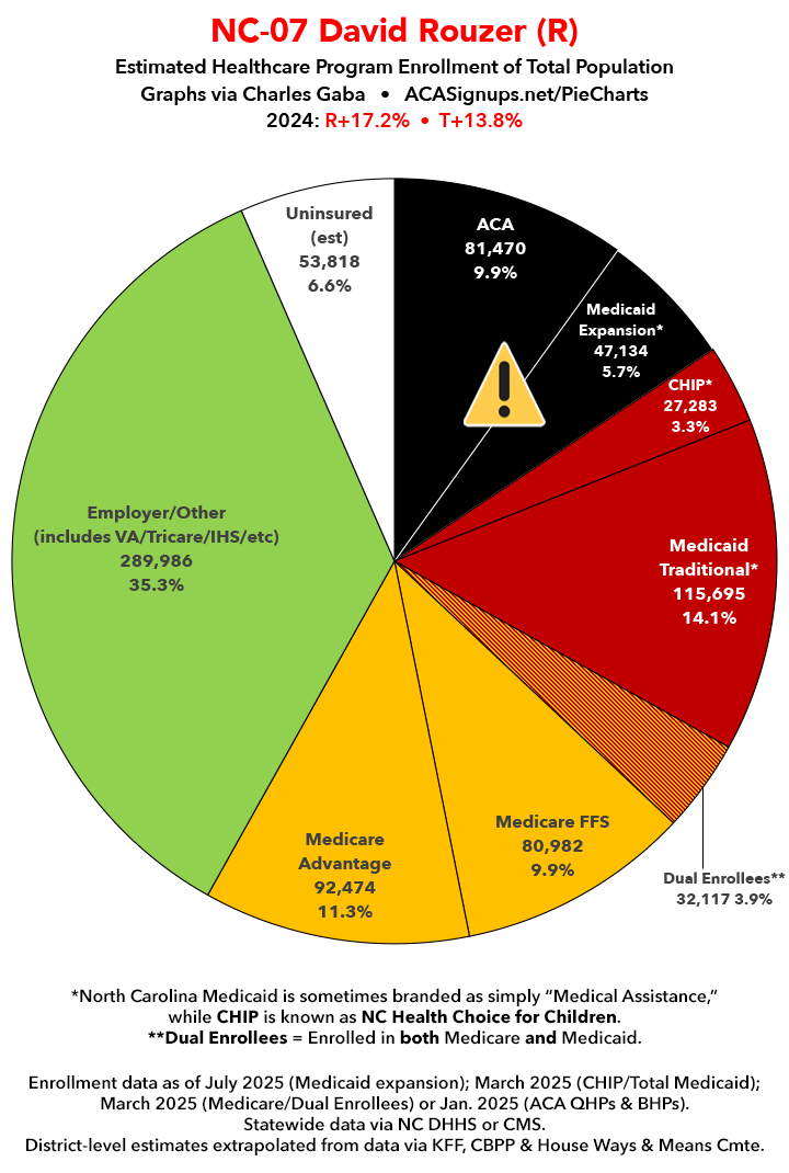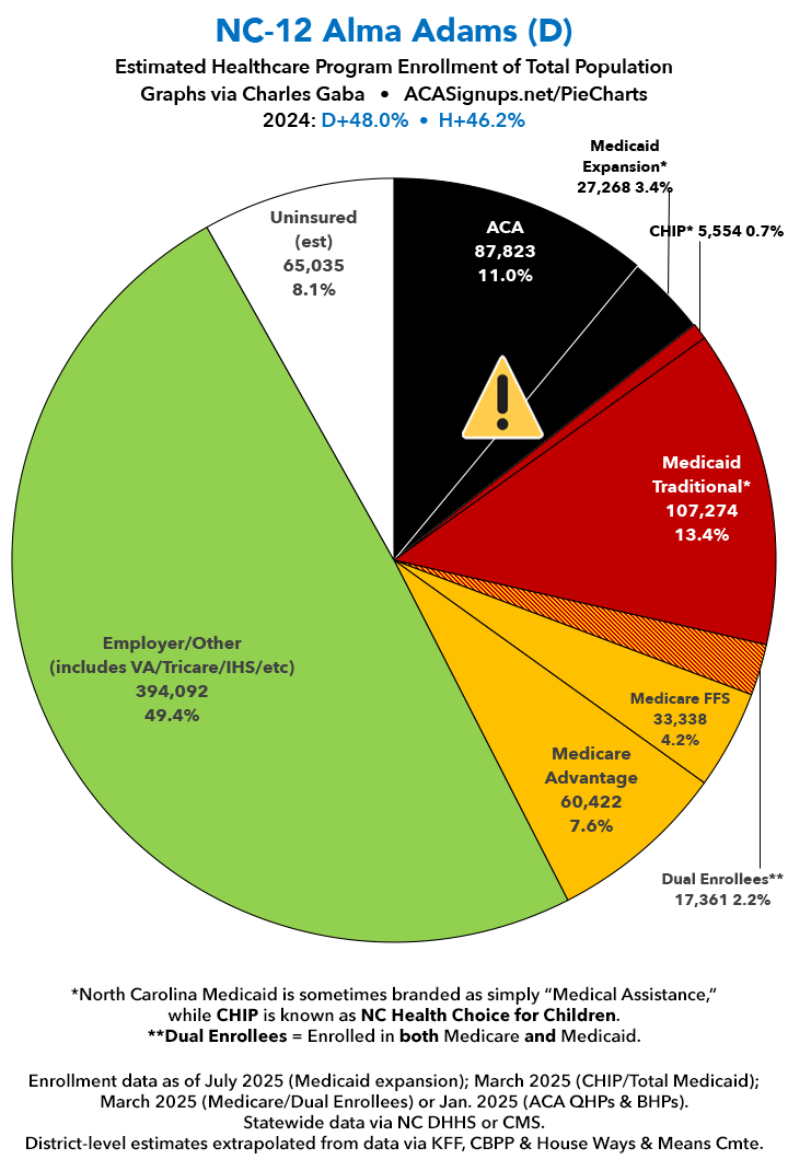 UPDATE 7/9/25: I've updated the web versions of the graphics with the most up-to-date enrollment data I have access to. The black sections w/the ⚠️ symbol are those most at risk of losing healthcare coverage due to H.R. 1, the "One Big Beautiful Bill Act" (aka the #MAGAMurderBill).