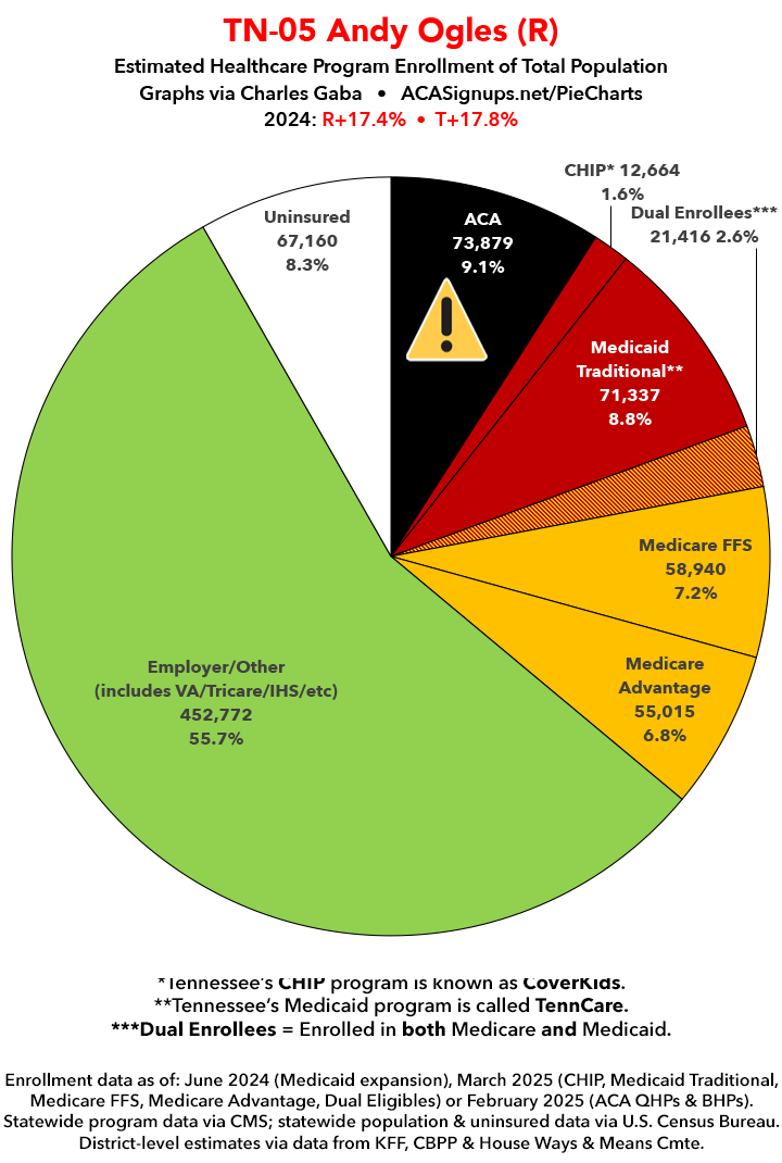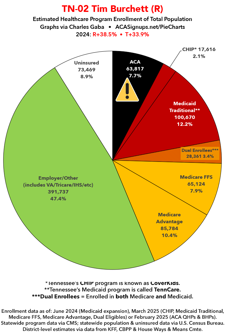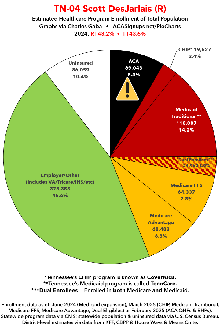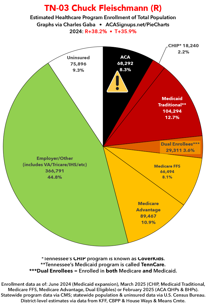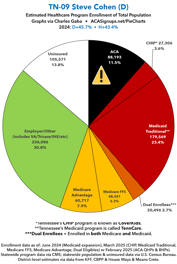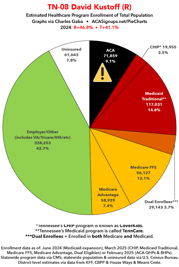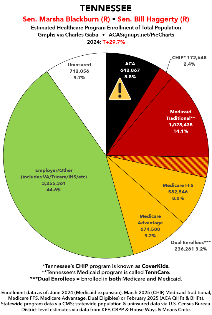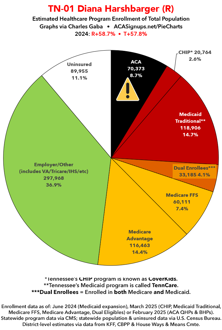UPDATE 7/11/25: I've updated the web versions of the graphics with the most up-to-date enrollment data I have access to. The black sections w/the ⚠️ symbol are those most at risk of losing healthcare coverage due to H.R. 1, the "One Big Beautiful Bill Act" (aka the #MAGAMurderBill).