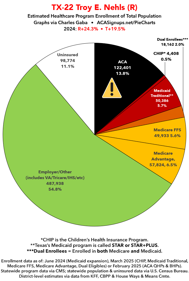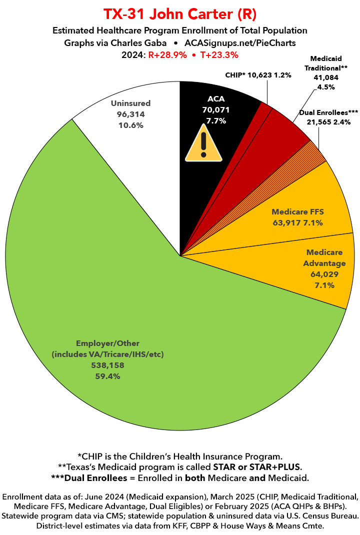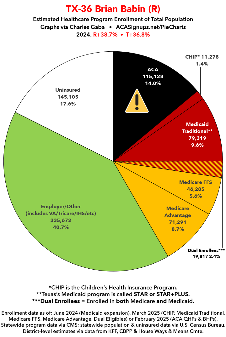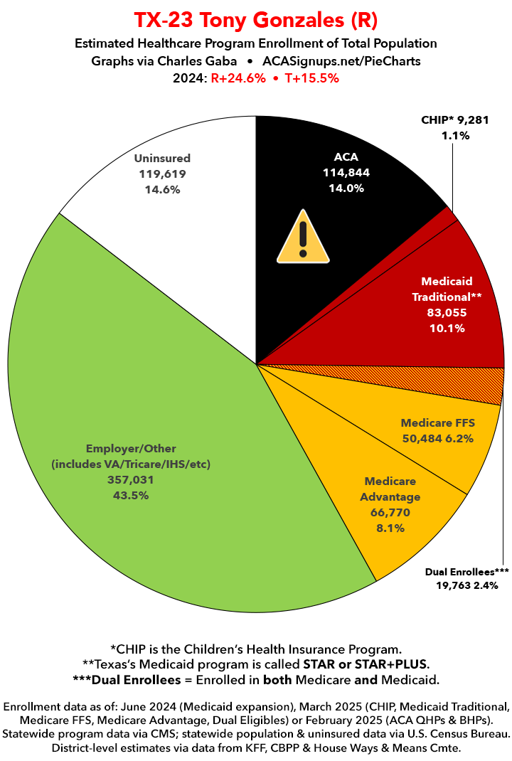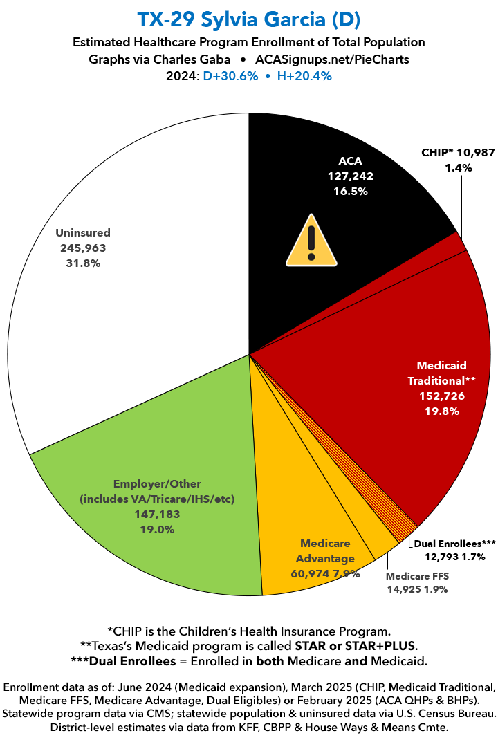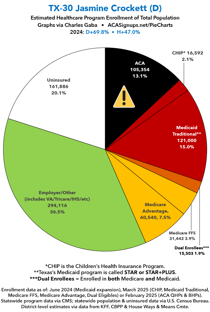UPDATE 7/14/25: I've updated the web versions of the graphics with the most up-to-date enrollment data I have access to. The black sections w/the ⚠️ symbol are those most at risk of losing healthcare coverage due to H.R. 1, the "One Big Beautiful Bill Act" (aka the #MAGAMurderBill).