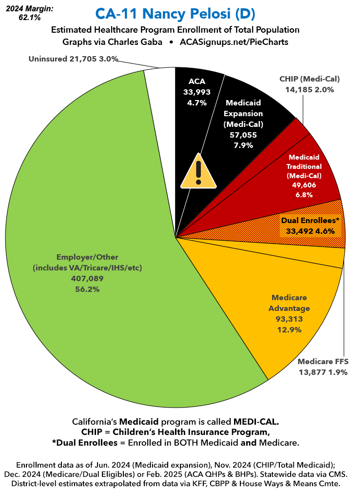 With the pending dire threat to several of these programs (primarily Medicaid & the ACA) from the House Republican Budget Proposal which recently passed, I'm going a step further and am generating pie charts which visualize just how much of every Congressional District's total population is at risk of losing healthcare coverage.