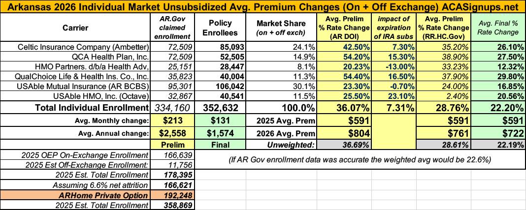 • The original version of this analysis included a 4.3% increase in the unsubsidized benchmark plan premium based on a projection by the Congressional Budget Office. However, that was a national average projection which didn’t take into account other factors like increased utilization, medical inflation and so on. This updated version assumes the actual 2026 Arkansas rate filings which average 35.7% statewide.
